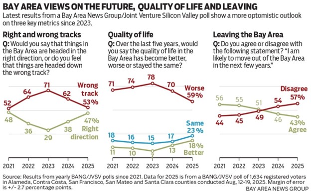 The latest Bay Area News Group and Joint Venture Silicon Valley poll surveyed 1,634 registered voters across Alameda, Contra Costa, San Francisco, San Mateo, and Santa Clara counties. Results show a slow but noticeable rise in optimism about the Bay Area being on the right track, an important shift following the low point of 2023