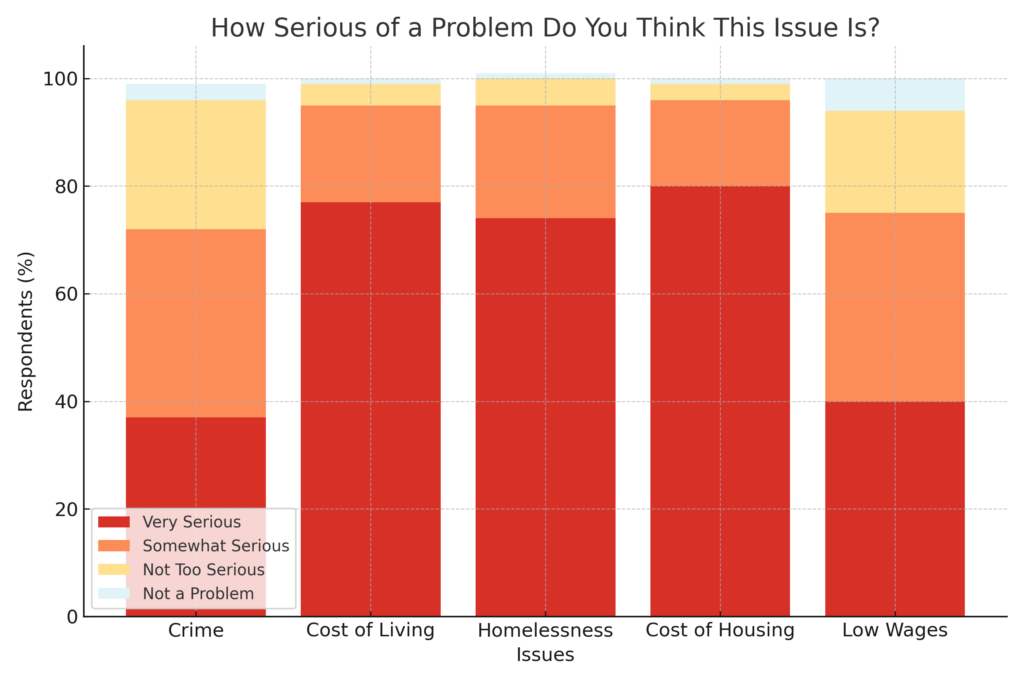 - 77% say the cost of living is a very serious issue, and 80% say the same for housing costs.